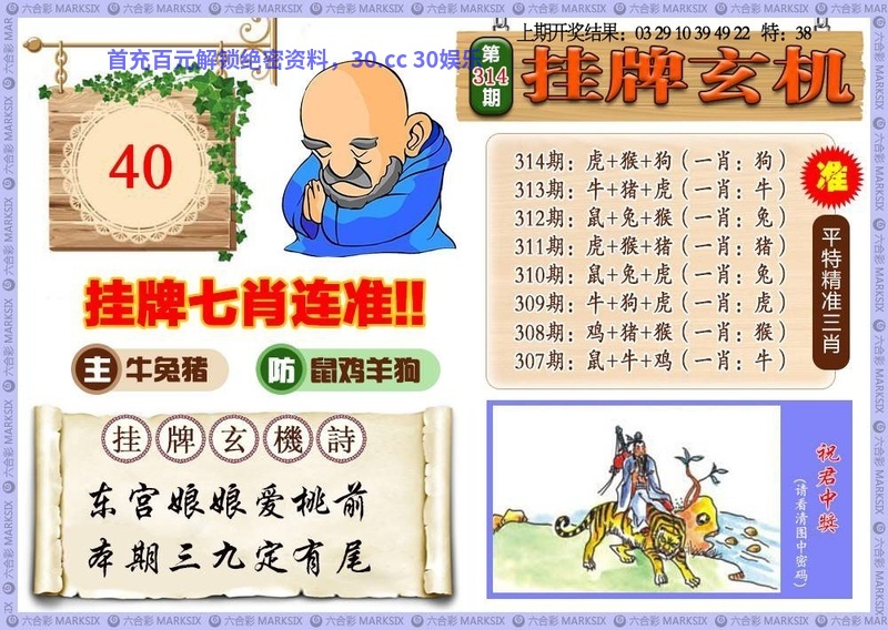 | 300期七肖 | 鼠龙鸡虎马羊狗 | 开:虎40 |
